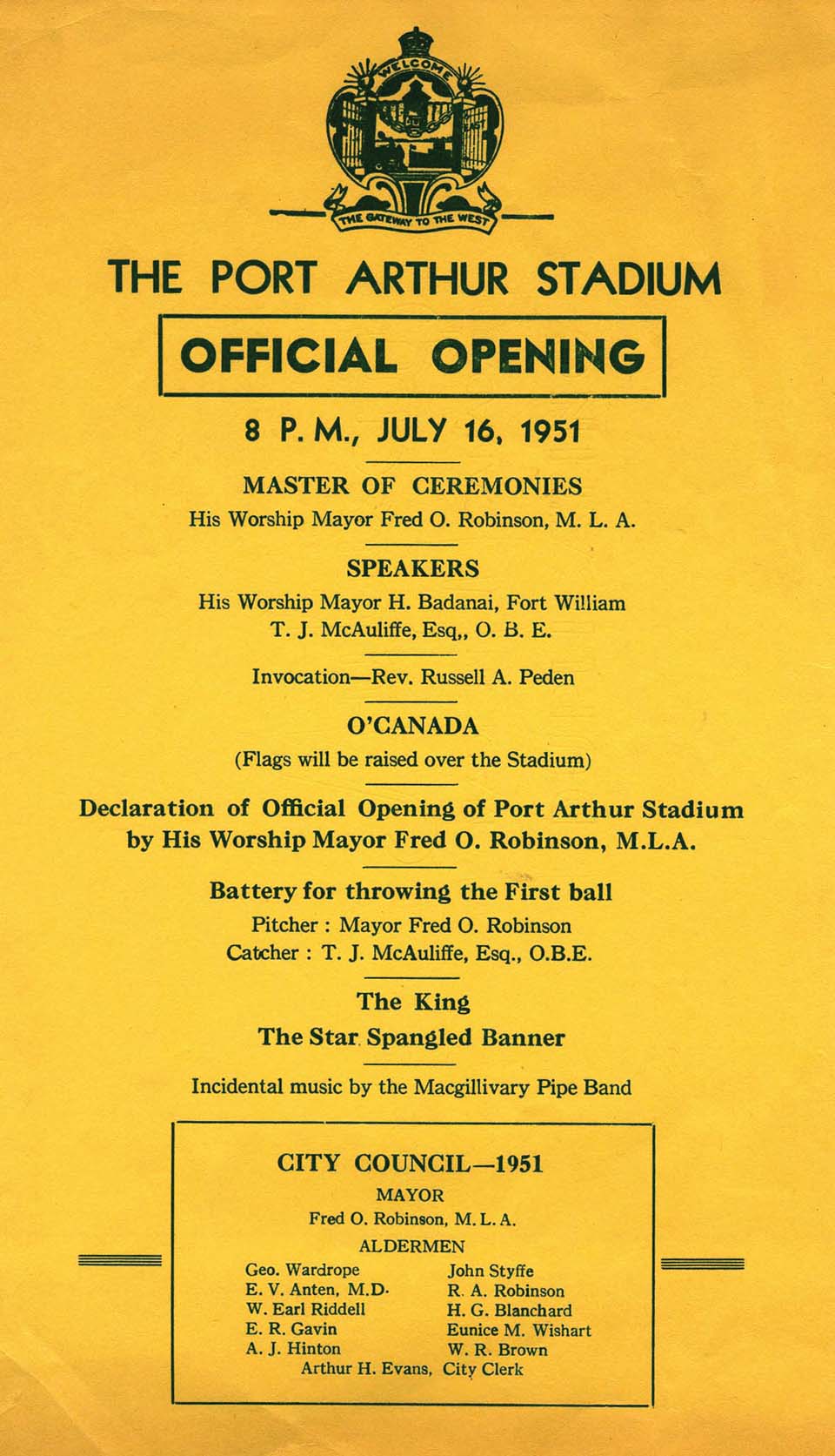 The opening night saw a reported overflow crowd of up to 4,000 pack the new concrete stands and portable bleachers. The McGillivray Pipe Band paraded on the grounds before the opening ceremonies got underway. Following a variety of speeches and the invocation by Reverend Russell Peden, Port Arthur Mayor Fred Robinson had the honour of throwing the first pitch to McAuliffe who finally saw his dream of a new stadium become a reality.